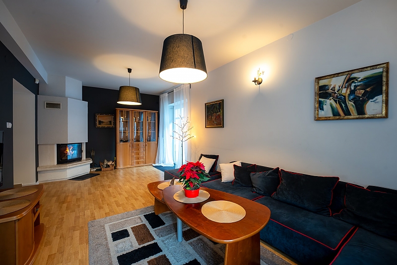 Sypialnie w dużej części posiadają własne łazenki, salon z kominkiem i wyjściem na taras oraz duża w pełni wyposażona kuchnia pozwalaja na komfort wypoczynku.