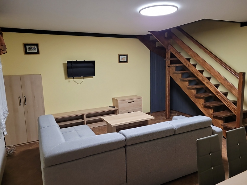 - parter: przestronny salon wyposażony w zestaw wypoczynkowy, TV, aneks kuchenny, jadalnia i łazienka