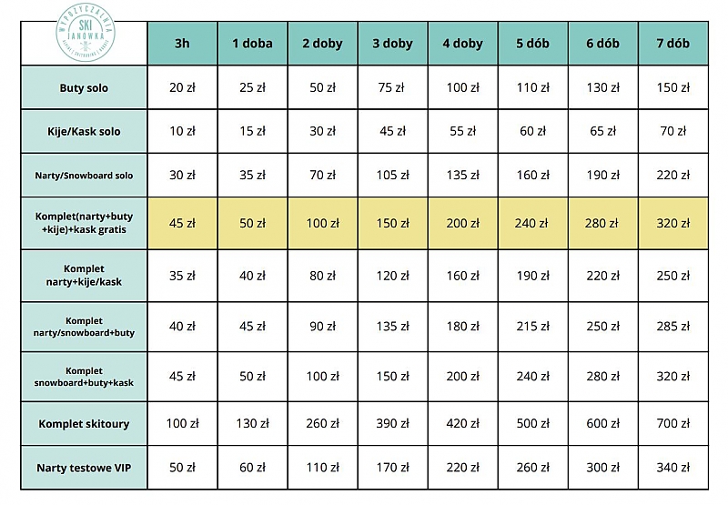 Cennik wypożyczalni nart w Tyliczu jest przejrzysty – dostępne są dwie opcje wypożyczenia: na 3 godziny lub na dobę. Ile kosztuje wypożyczenie nart? W zależności od modelu, cena wypożyczenia nart zaczyna się już od 40 zł (za 3-godzinną sesję) i 50 zł (za pełną dobę). Dla miłośników zjazdów na desce mamy także ofertę snowboardów – cena wypożyczenia snowboardu w Tyliczu to 40 zł na 3 godziny lub 50 zł za dobę. Wszystkie sprzęty są regularnie serwisowane i gotowe do natychmiastowego użycia. Dokładne informacje o kosztach wynajęcia sprzętu znajdziesz w załączonej w galerii tabeli.